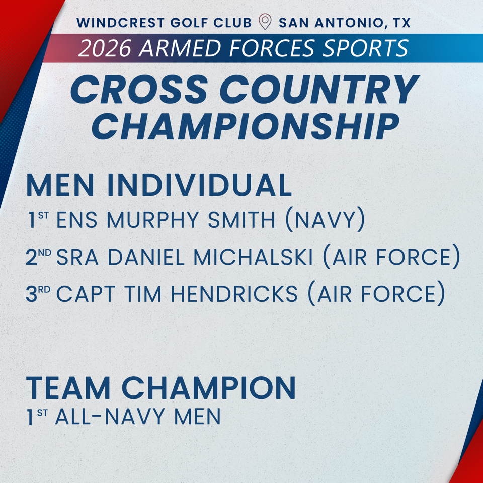 Gold: ENS Murphy Smith, Boston, MA - Navy - 31:15.1 Silver: SrA Daniel Michalski, Lackland AFB, TX - USAF - 31:25.1 Bronze: Capt Timothy Hendricks, Naval Medical Center San Diego, CA - USAF - 31:28.4 4th Place: ENS Alexander Kirkland, Pensacola, FL - Navy - 31:30.0 5th Place: 1st Lt Ryan Johnson, Hanscom AFB, MA - USAF - 31:37.8 6th Place: LCDR Stan Linton, Millingonton, TN - Navy - 31:42.1 7th Place: 1st Lt Ryan Ioanidis, Fairchild AFB, WA - USAF - 31:50.0 8th Place: LTJG Brett Brady, Corpus Christi, TX - Navy - 31:58.8 9th Place: CPT Sam Chelanga, Fort Bragg, NC - Army - 32:09.3 10th Place: SGT Bernard Keter, Fort Carson, CO - Army - 32:19.1 11th Place: Capt Lucas Stalnaker, MCRD San Diego - USMC - 33:07.3 12th Place: ENS Thomas Fodor, Pensacola, FL - Navy - 33:11.2 13th Place: LT Zachary Anderson, Silverdale, WA - Navy - 33:21.4 14th Place: Maj Matthew Williams, Fort Sam Houston, TX - USAF - 33:31.4 15th Place: SrA Brett Greene, McChord AFB, WA - USAF - 33:41.4 16th Place: LT Thomas Slattery*, Washington, DC - Navy - 34:03.0 17th Place: SPC Evans Kibet, Denver, CO - Army - 34:14.6 18th Place: Capt Kyle Eller, Defense Innovation Unit, CA - USAF - 34:23.9 19th Place: 1LT Matthew Porter, Shape, AE - Army - 34:31.8 20th Place: 2LT Isaac Morris, West Point, NY - Army - 34:39.9 21st Place: 2ndLt Naphtali Moulton, MCB Quantico - USMC - 34:47.8 22nd Place: Capt Bradley Ferner, MCB Quantico - USMC - 35:07.8 23rd Place: CPT Connor Roche, West Point, NY - Army - 35:26.0 24th Place: 1LT Nicholas Kipruto, Fort Carson, CO - Army - 35:50.5 25th Place: 1stLt John Cranston, NAS Corpus Christi - USMC - 36:08.6 26th Place: 1stLt Jeremy Bekkouche, MCB Camp Pendleton - USMC - 36:23.6 27th Place: 2ndLt Keagan Casey, MCB Camp Pendleton - USMC - 37:39.8 28th Place: Maj William Calkins, MCB Hawaii - USMC - 40:06.3 * Coast Guard Personnel