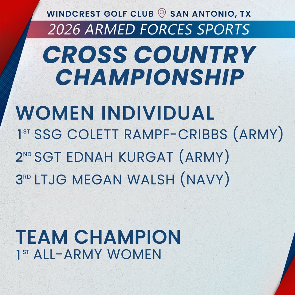 Gold: SSG Colett Rampf Cribbs, Fort Carson, CO - Army - 29:01.9 Silver: SGT Ednah Kurgat, Fort Carson, CO - Army - 29:03.7 Bronze: LT Megan Walsh, San Diego, CA - Navy - 29:44.7 4th Place: LT Madison Overby, Norfolk, VA - Navy - 30:05.3 5th Place: Capt Jaci Smith, Wright-Patterson AFB, OH - USAF - 30:37.8 6th Place: CPT Monika Horoho, Joint Base Lewis-McChord, WA - Army - 31:04.3 7th Place: LT Camille Herhusky, Newport, RI - Navy - 31:06.6 8th Place: 2nd Lt Allyson Peterson, Ramstein AB, GER - USAF - 31:19.9 9th Place: 2nd Lt Corrine Yorkman, Wright-Patterson AFB, OH - USAF - 31:28.2 10th Place: 2LT Lilian Richards, Fort Gordon, GA - Army - 31:52.5 11th Place: Maj Phaelen French, Wright-Patterson AFB, OH - USAF - 32:11.3 12th Place: Lt Col Erin Bellissimo, Buckley SFB, CO - USAF - 32:27.1 13th Place: LTJG Jacquelynn Sheedy*, Detriot, MI - Navy - 32:43.0 14th Place: LTC Kelly Calway, West Point, NY - Army - 32:45.0 15th Place: LTJG Hannah Walz, Pensacola, FL - Navy - 32:45.1 16th Place: Capt Grace Chow, MCB Quantico - USMC - 33:11.1 17th Place: Capt Annelise Rowe, Gowen Field, ID - USAF - 33:17.1 18th Place: LCDR Katie Irgens, Washington, DC - Navy - 33:35.4 19th Place: 1LT Keysh Meijas Martinez, Fort Bliss, TX - Army - 33:41.6 20th Place: 1stLt Mary Miranda, MCB Camp Pendleton - USMC - 34:14.6 21st Place: Capt Anne Pentaleri, MCAS Kaneohe Bay - USMC - 35:54.5 22nd Place: LtCol Christine Taranto, MCB Camp Pendleton - USMC - 36:16.9 23rd Place: Capt Tina Li, MCAS Cherry Point - USMC - 37:50.5